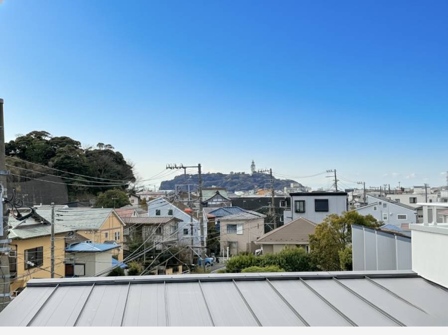江の島を望むパノラマビューと広々としたルーフバルコニー(約6.5〜7.7畳)から望む江の島のパノラマビューです 。