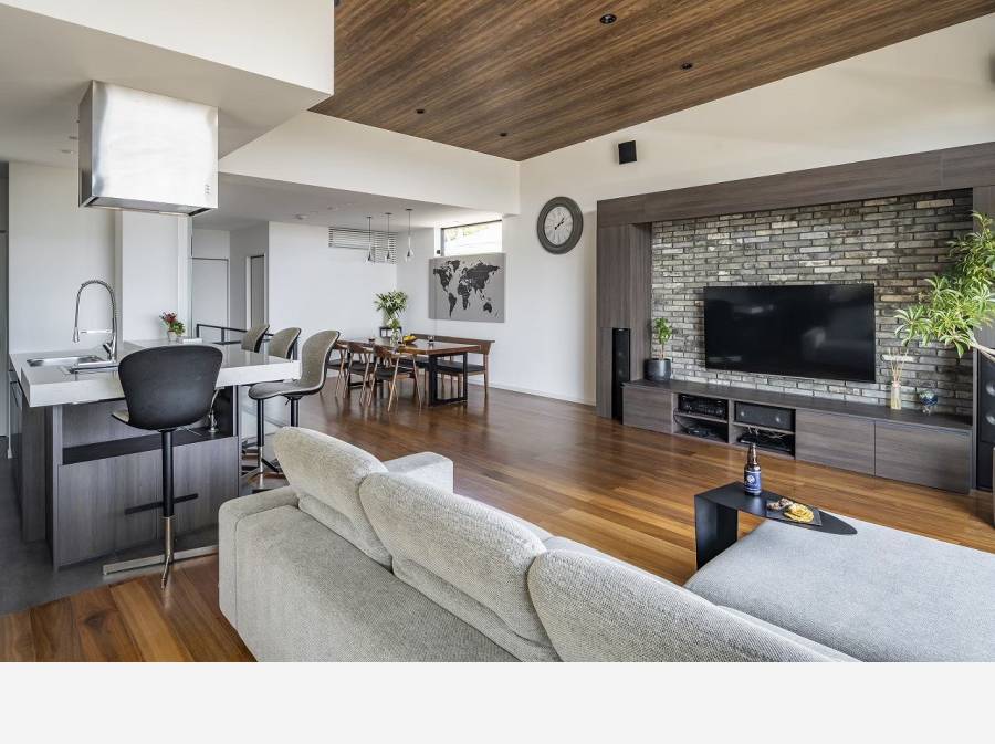 船を思わせるキッチン、そして海を眺めながら寛げるラウンジのR形状家具など、