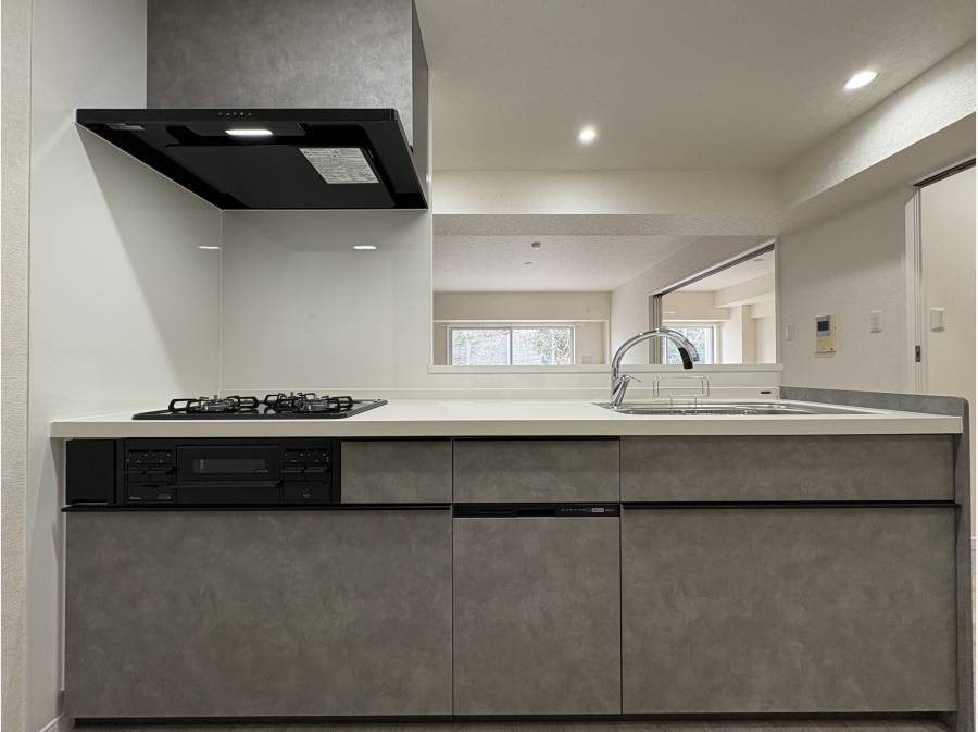 LDKは16帖。対面式のシステムキッチン。キッチンスペースにはパントリーを設け、快適に調理することができる間取りです!