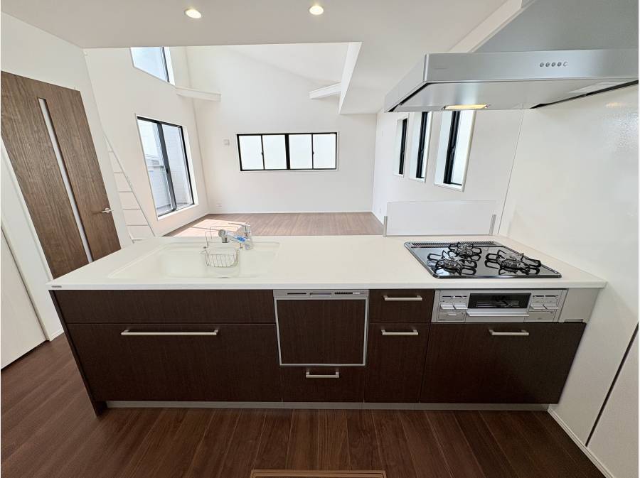 対面式のシステムキッチンは食洗機付きで家事の手間を減らしてくれる嬉しい機能がついています。