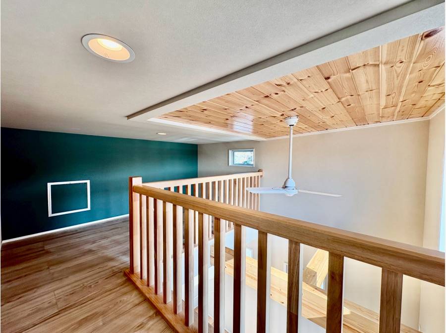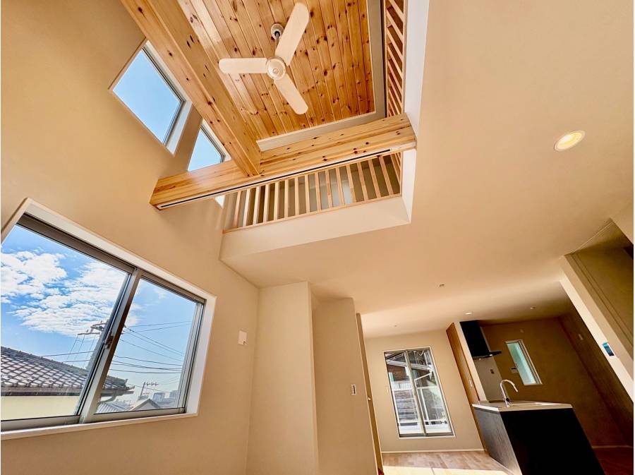 吹抜けの開放感あふれるLDKやブルークロスのロフトスペース、、
