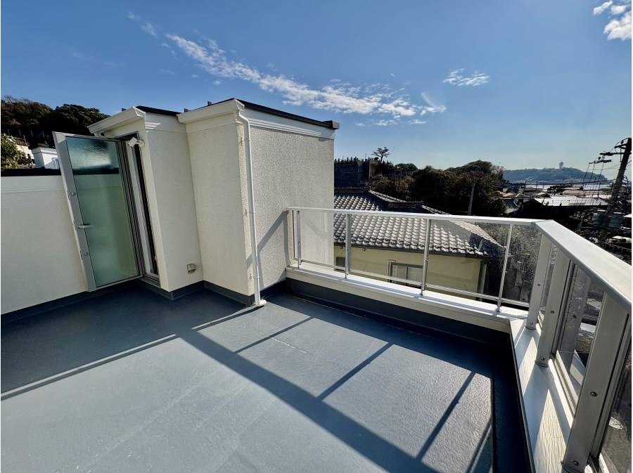 大きなルーフバルコニーからは海や江の島が一望できる。