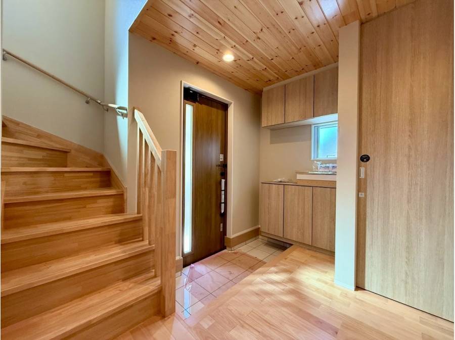 内装は、床材から玄関ポーチに至るまで無垢板を贅沢に使用。