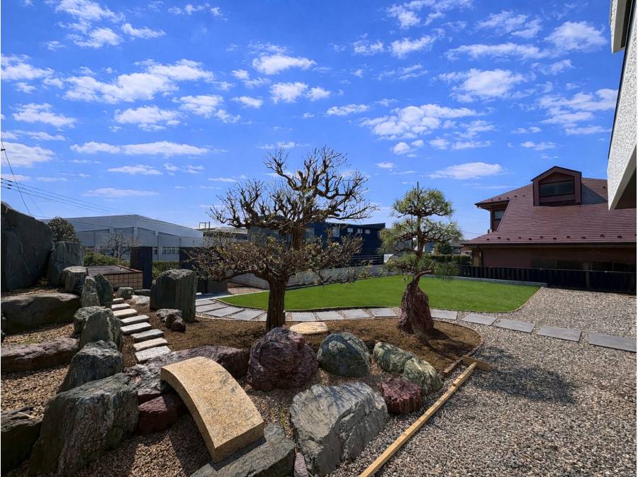 石畳のアプローチと庭園美。四季を感じる贅沢な外構設計。
