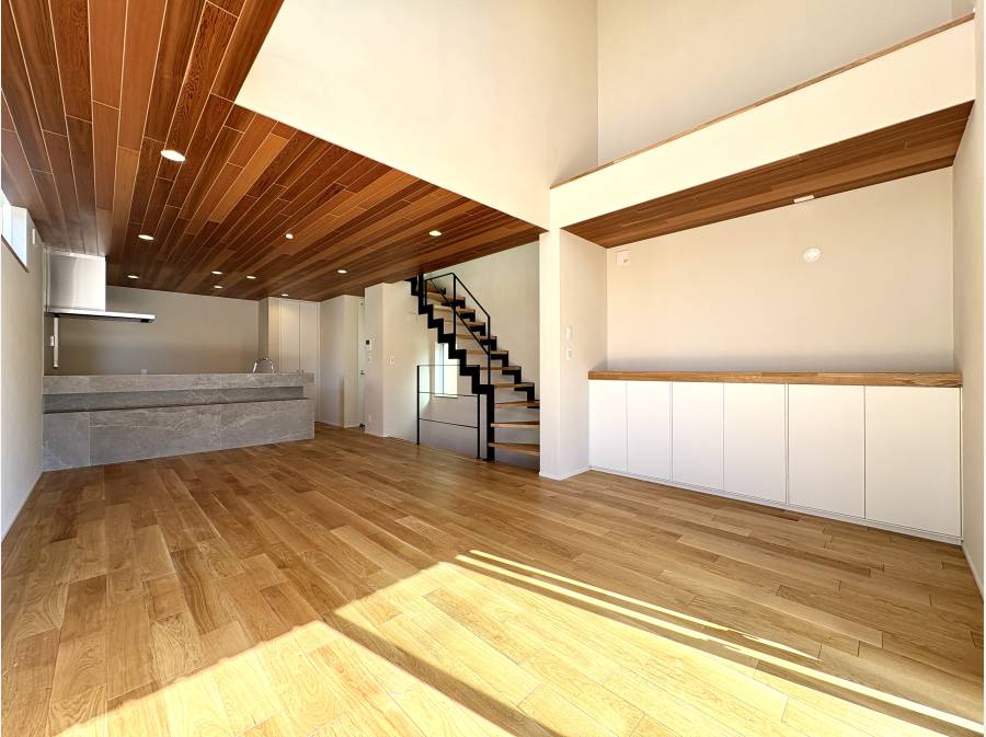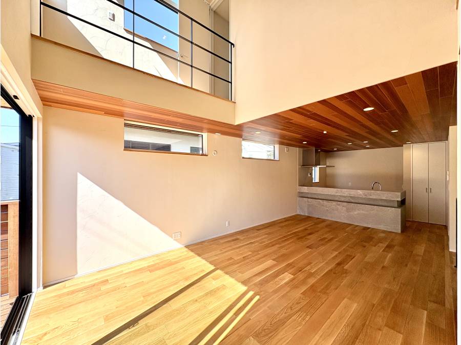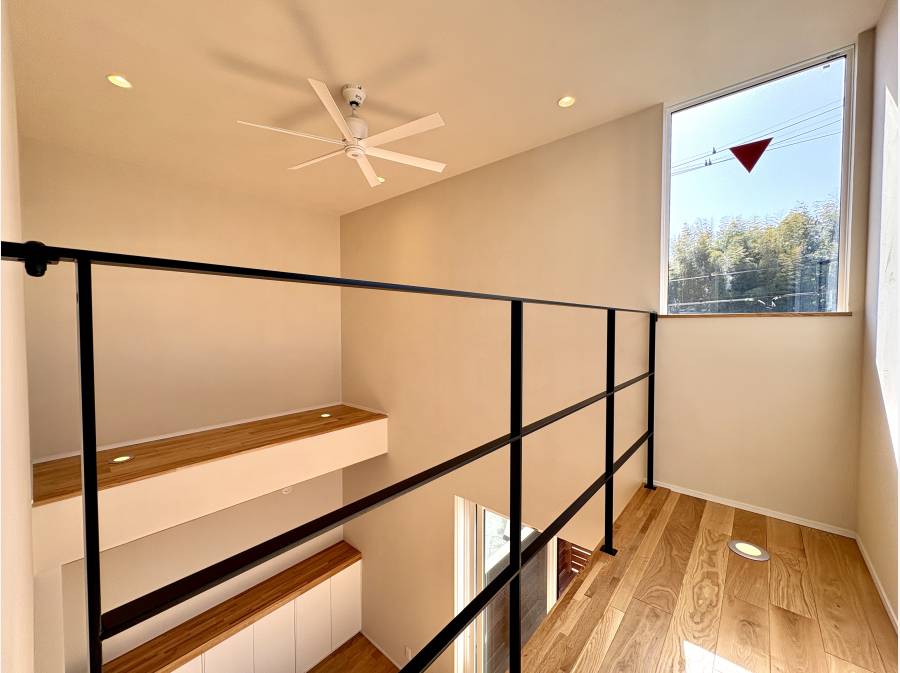 最大の見どころは、光が降り注ぐ2階リビングの吹き抜けと、その空間を横切るキャットウォークです。