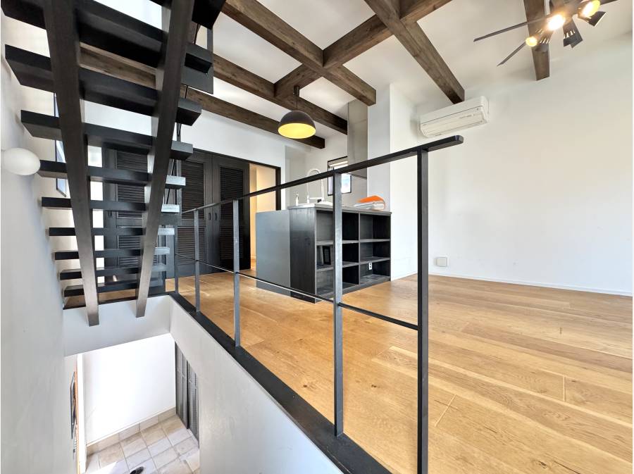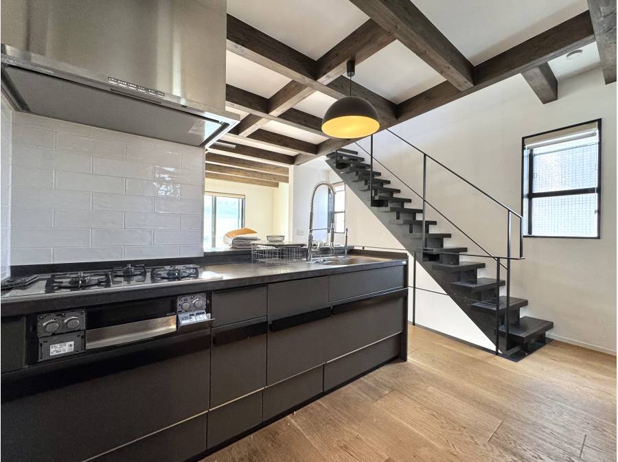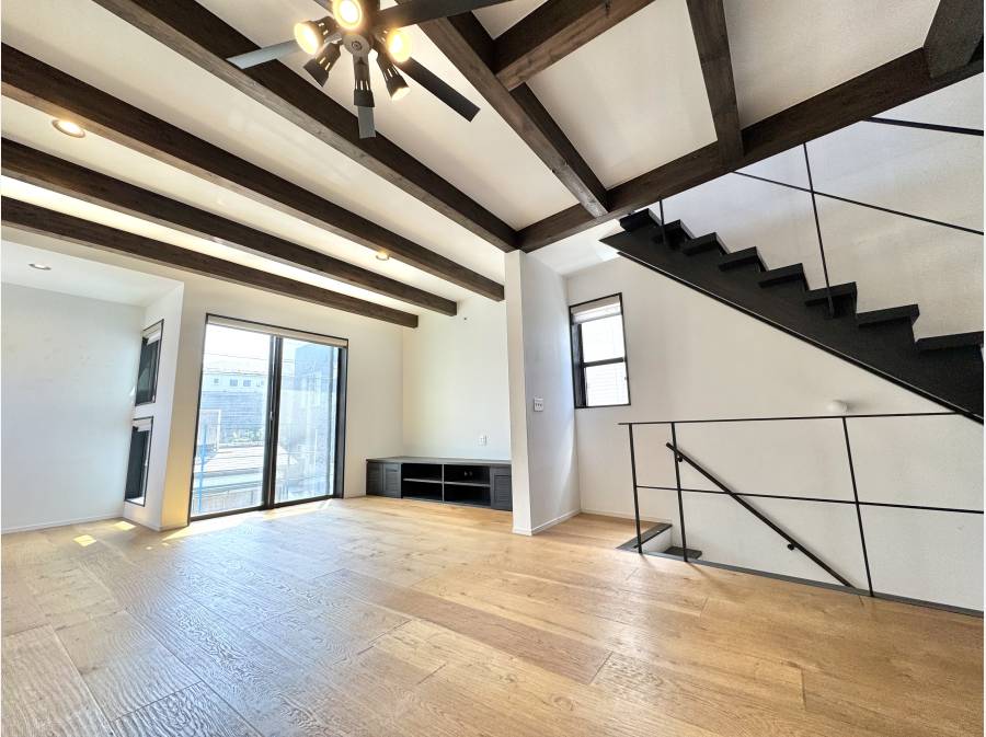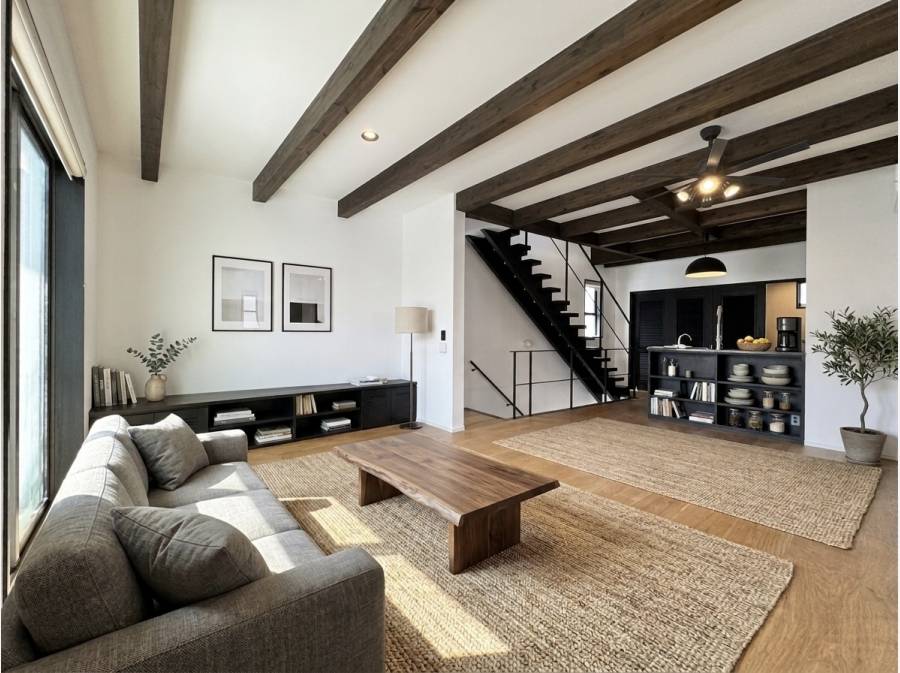 材木座海岸まで徒歩10秒(約10m)ボードを抱えて玄関を出れば、もうそこは海。室内は、木の温もりとアイアンの無骨さが調和した開放的な空間。ガレージスペースも備え、サーフィンやアウトドアといった趣味もより身近に。