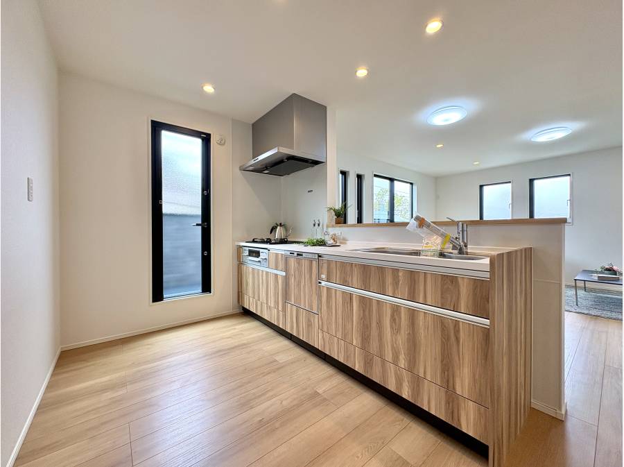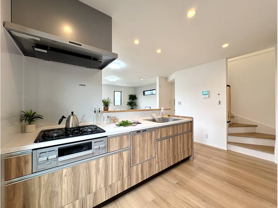 2階には約18.1帖の広々としたLDKを配し、対面式の浄水器付キッチンが家事効率と家族の会話を支えます。