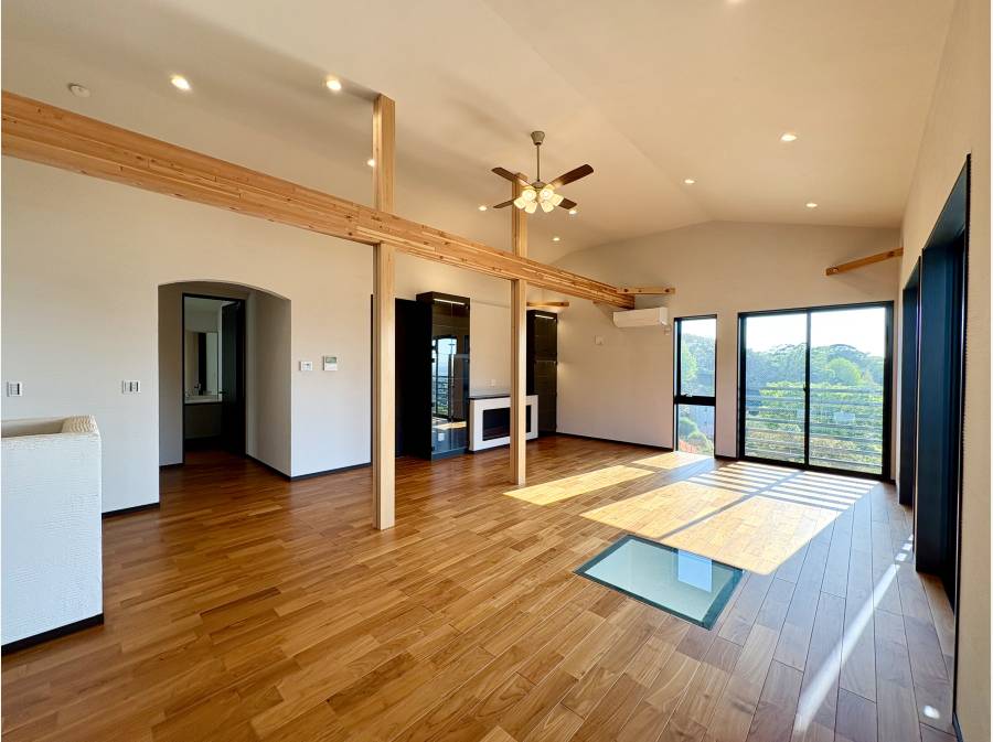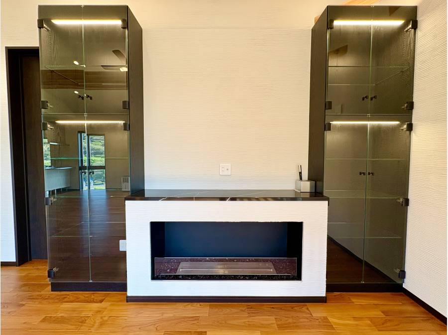 約31帖の広々としたリビングからは、相模湾を越えて富士山と江ノ島を一望できる贅沢な景色が広がります。室内には暖炉があり、四季折々の風景を楽しみながら、上質な時間を過ごせる空間が整っています。