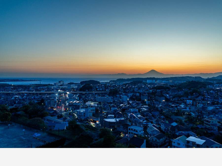 近景には三浦半島の柔らかな山並み、足元にはジオラマのようにきらめく街並み。