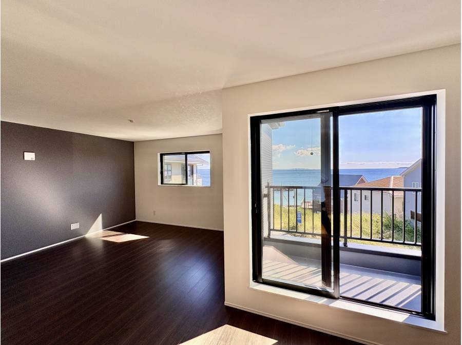 リビングから水平線を望める新築物件が登場しました。高台に位置し、高潮のリスクも少ないようです。海の近くでゆったり過ごしたい方におすすめです。