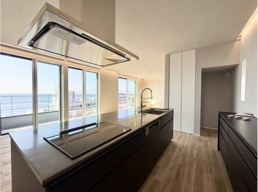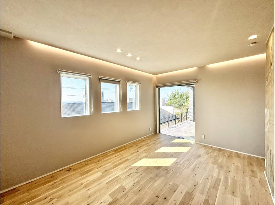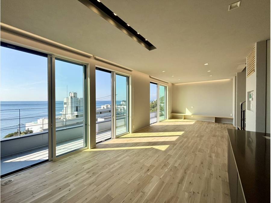 LDKは約26帖、南向きの大開口からは柔らかな陽光が差し込み、海風が心地よく通り抜けます。白を基調とした空間に無垢の木が映える、上質であたたかにのあるデザイン。屋上テラス刻一刻と表情を変える海を望み、夕暮れには富士山をシルエットにした幻想的な風景が広がります。