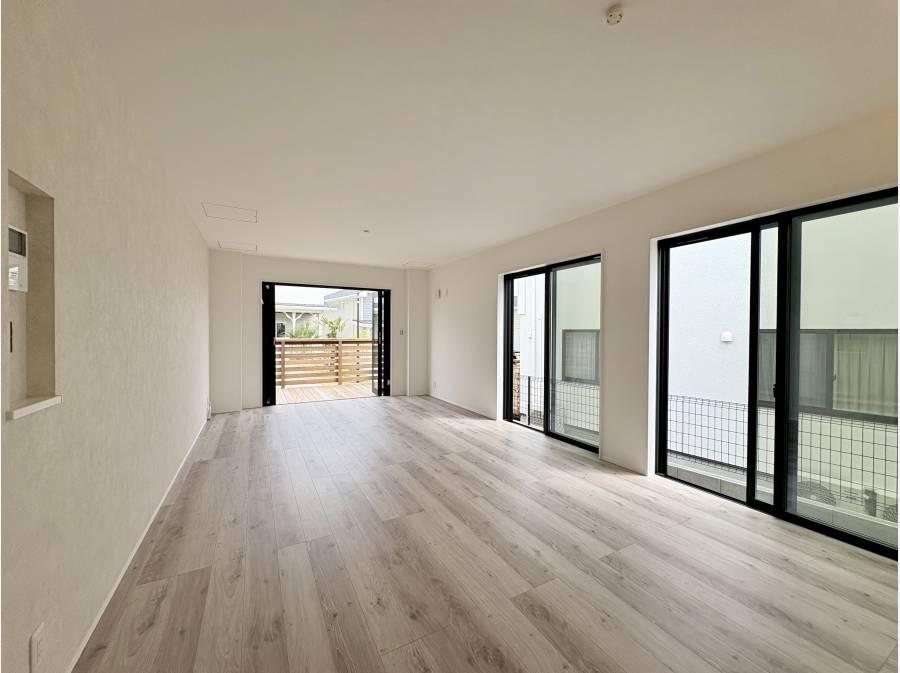 LDKは約19帖の空間。ワイドオープンサッシを施した窓からウッドデッキに出ることができ、開放感のある寛ぎ空間に仕上がっています。