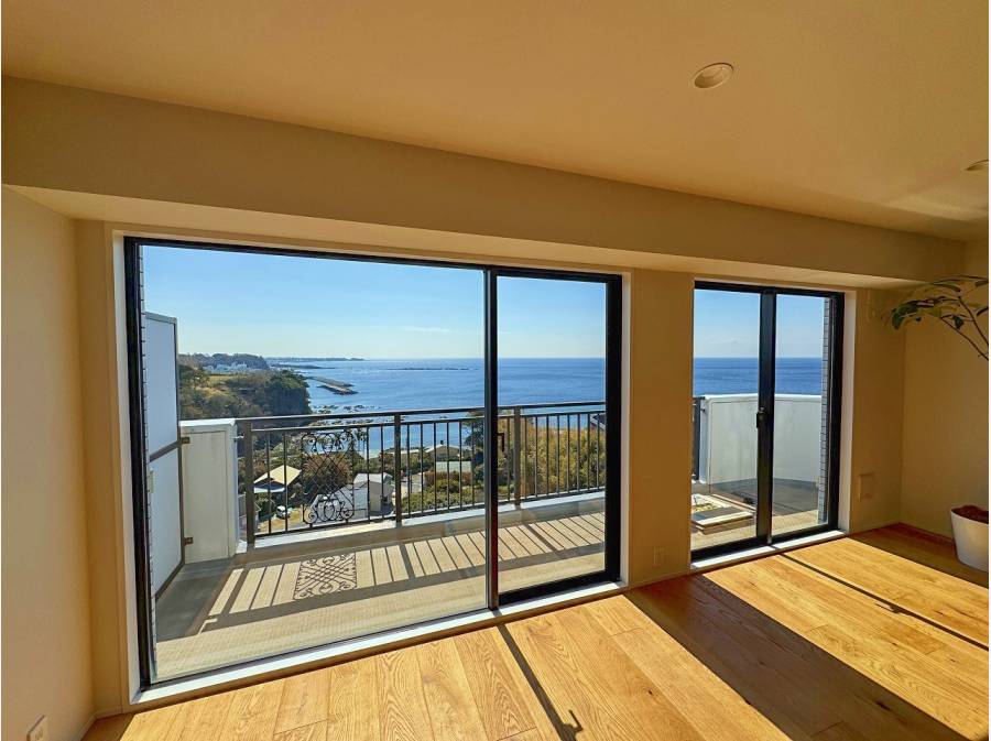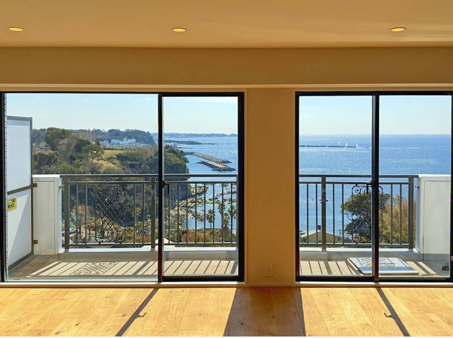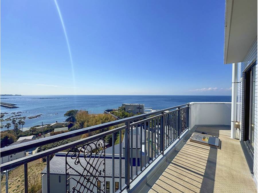 L字型のバルコニーからは、まさに大海原を一望。足元には名立たる豪邸が。
