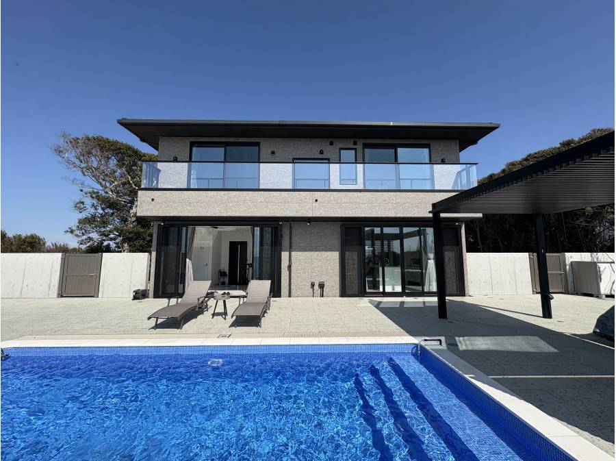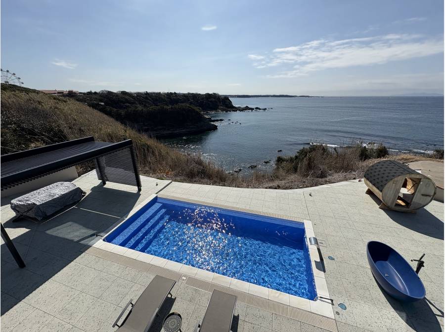 正面には大島で右側には富士山も見え、プール・サウナが有るプライベートリゾート