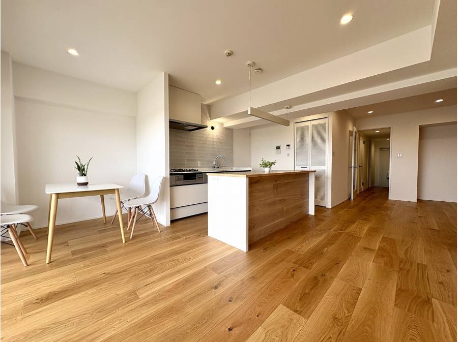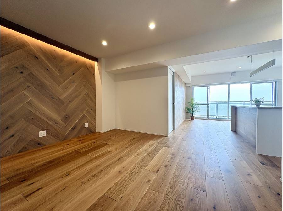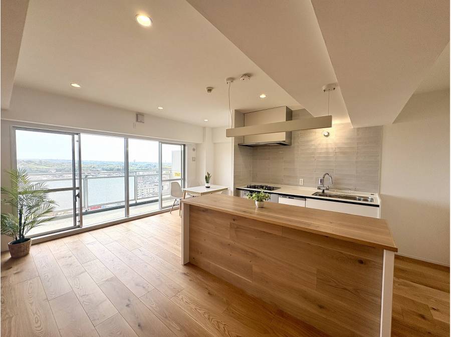 12階という高さがもたらす開放感と、南向きのやわらかな陽だまり。バルコニーの先には海を感じる景色が広がり、日常の中に自然のゆとりが溶け込んでいます。室内はフルリフォームが施され、無垢材のぬくもりが感じられる上質な空間に仕上がっており、約22帖のリビングは家族が自然と集まる中心の場所に。お子様が遊び、ご家族がくつろぎ、それぞれの時間が重なり合う暮らしがイメージできます。