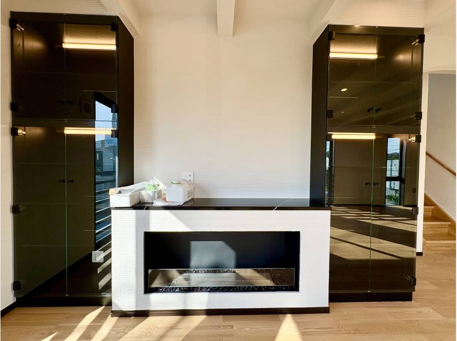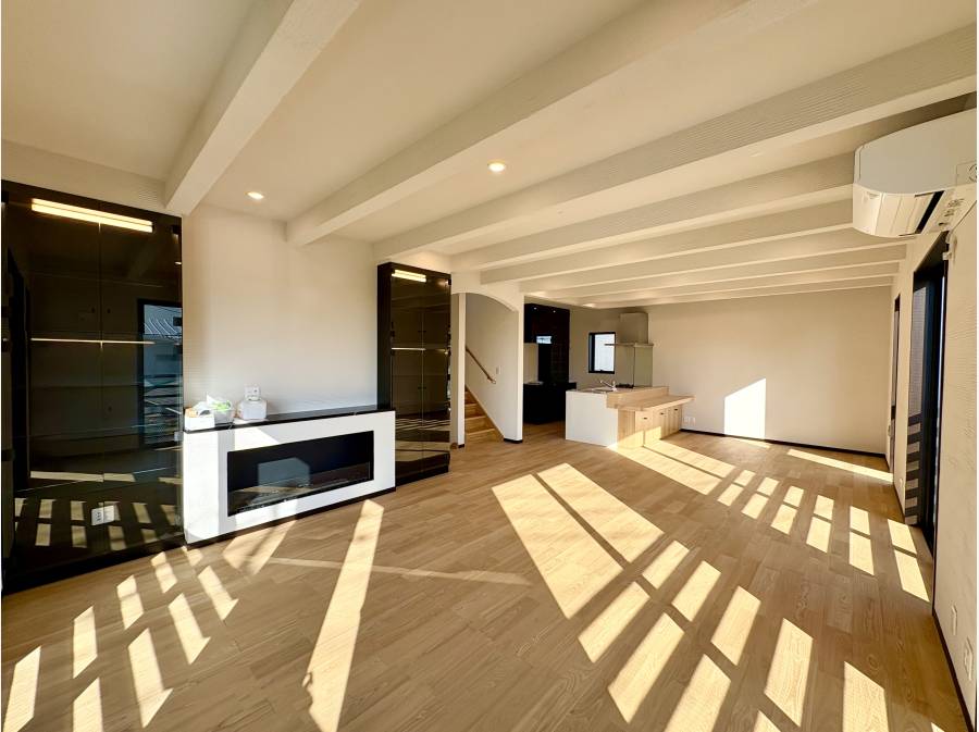 約27帖の広々としたリビングからは、相模湾を越えて富士山と江ノ島を一望できる贅沢な景色が広がります。室内には暖炉があり、四季折々の風景を楽しみながら、上質な時間を過ごせる空間が整っています。