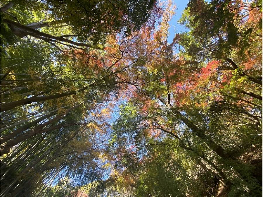 写真の通り、高台に位置した敷地は周りをぐるりと見渡せば360度の木々が...そして空を見上げると綺麗に紅葉したもみじが何本もそびえ立っています。