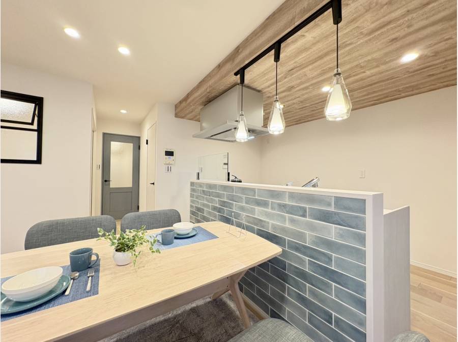 アイランド型キッチンの背面にあるお洒落なタイルがお部屋を彩ります