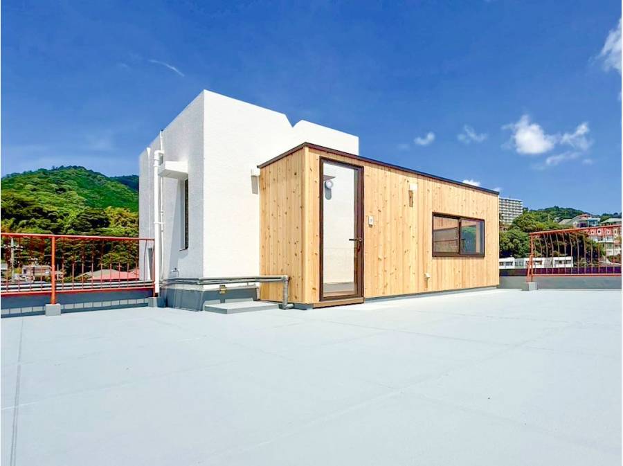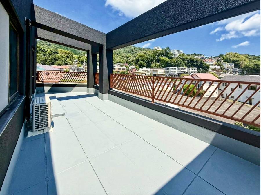3階の大型バルコニー、ルーフバルコニーから宇佐美海岸の海を望む物件で、