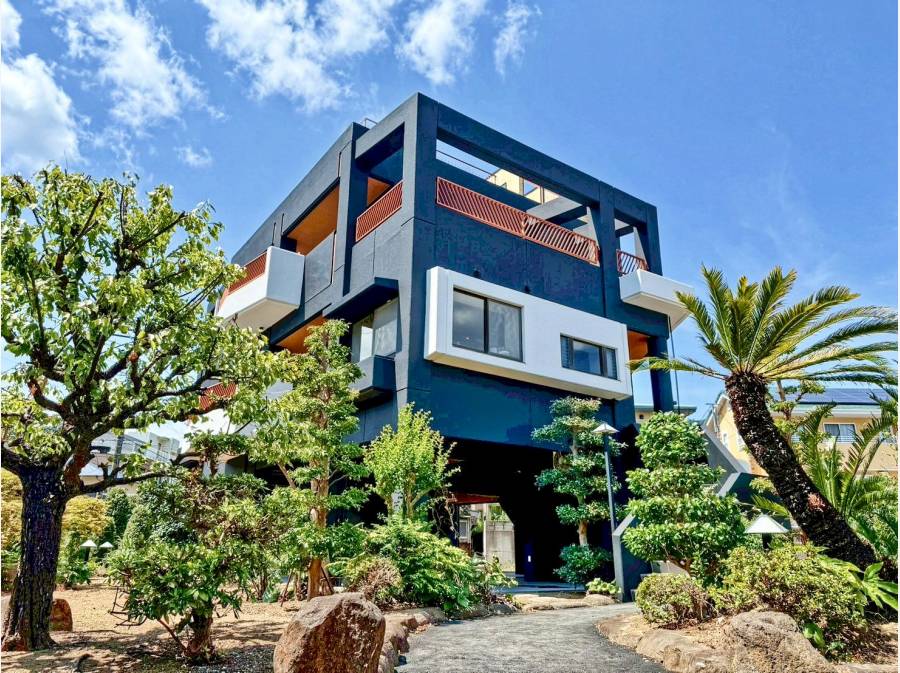 南国のリゾート感漂う外構と植栽に囲まれ、海をイメージさせる建物外観です