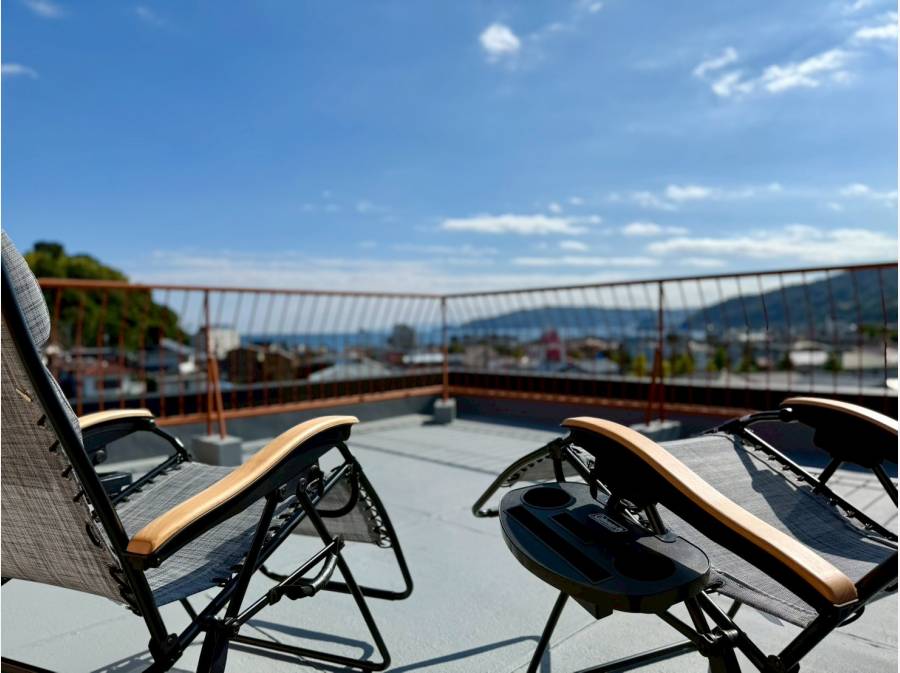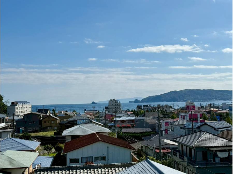 バルコニーから望む、青く広がる海と穏やかな山並み