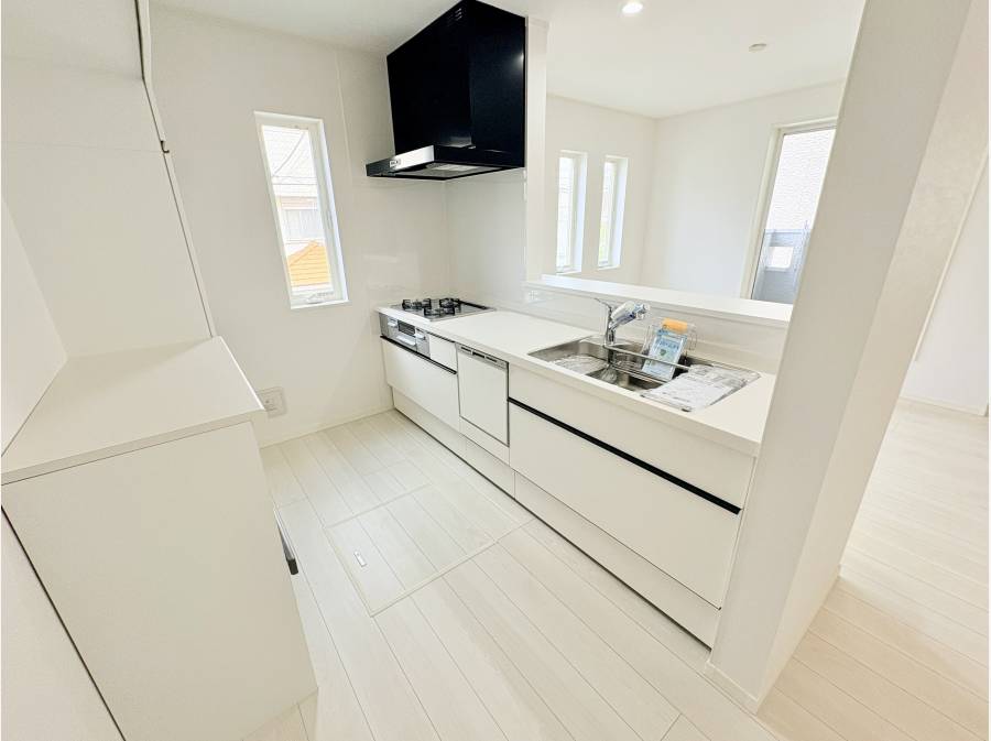 ご家族の様子を見守れる対面式キッチンには、食器洗浄乾燥機やガラストップコンロ、カップボードを備えています 。