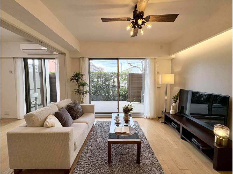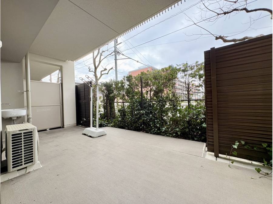 一番の見どころは専用テラスが広く。休日は日光浴や読書を愉しめるプライベートな空間が広がります。