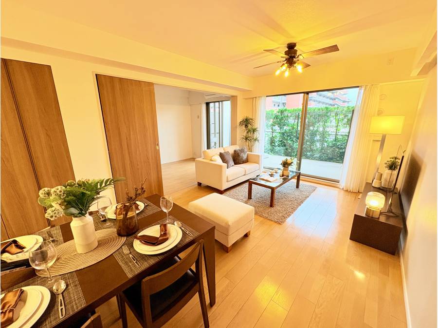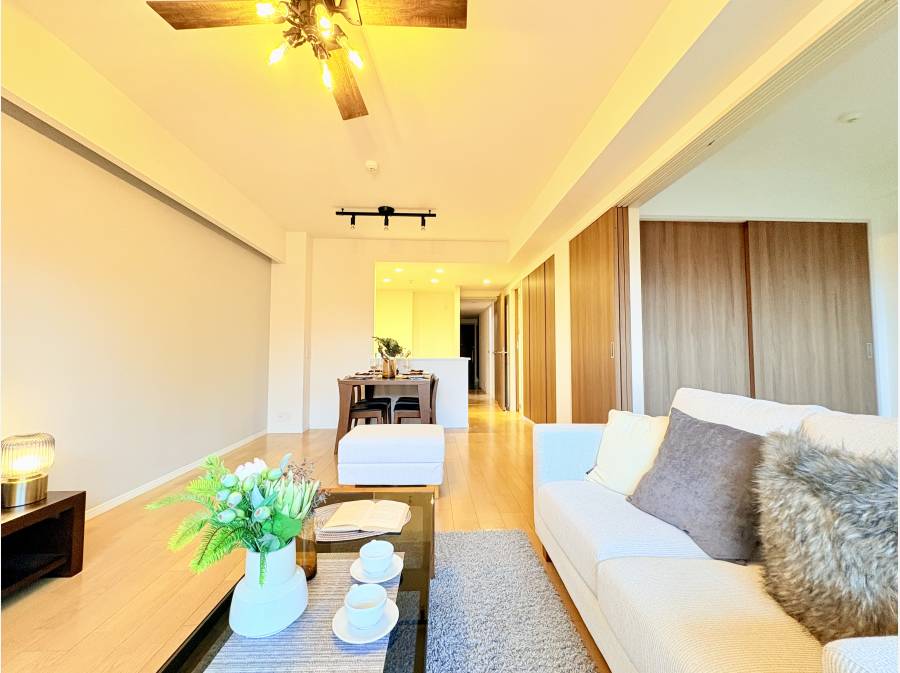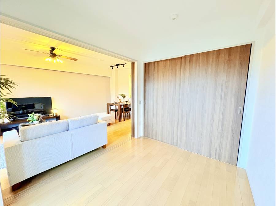 シーリングファンが回る約12.5帖のLD。床暖房付きで冬も快適です