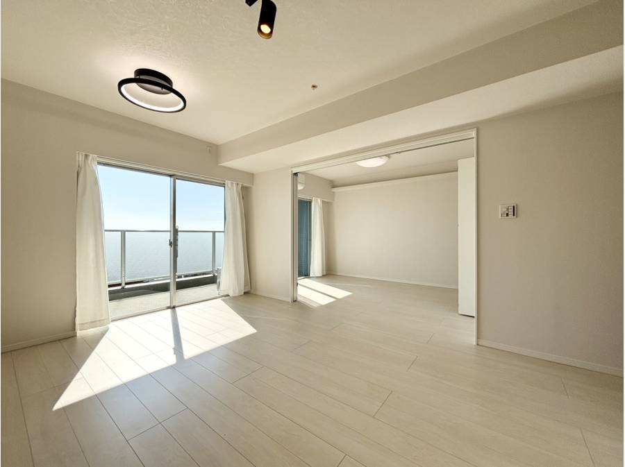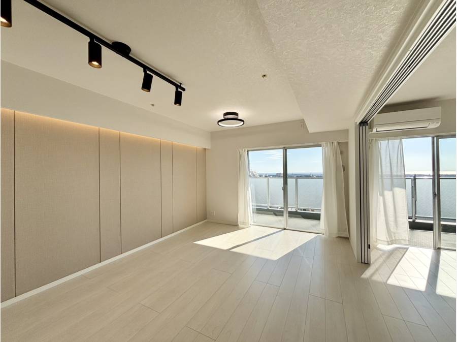 バルコニーからは開放的な眺望が広がり、晴れた日には空の広がりと街並みを一望。明るい陽光が差し込むLDKは約13.5帖のゆとりある空間です。