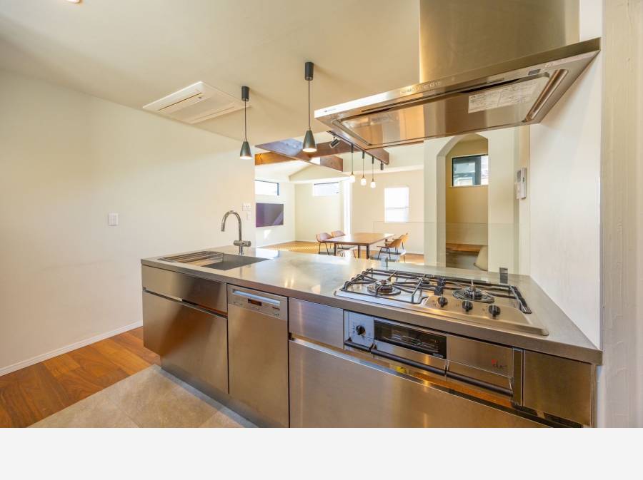 LDに大きな天井梁と照明にダクトレールを採用し住まう方のご趣味や季節ごとのライティングにも配慮、スポットライトやおしゃれなペンダント照明で楽しめそうですね♪