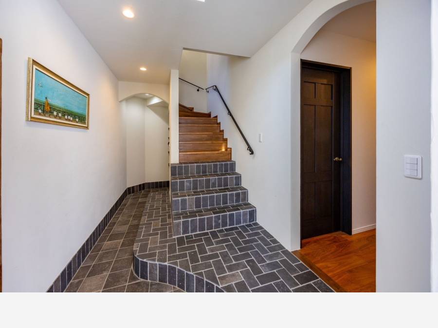 土間タイルの空間が広がるコントラストの効いた玄関ホール。