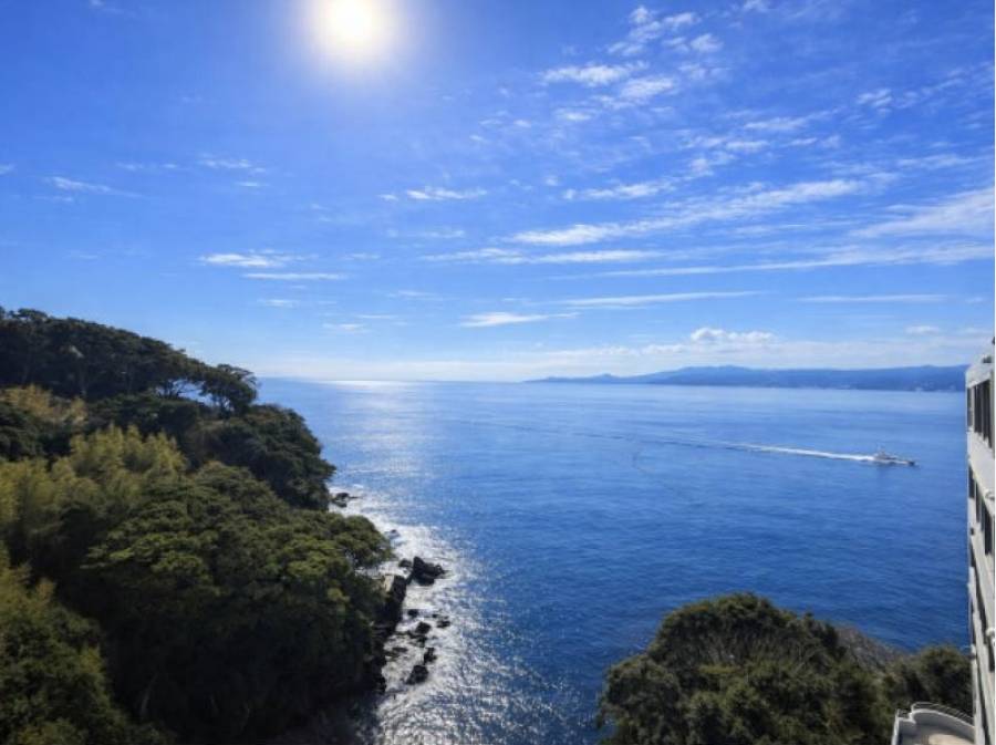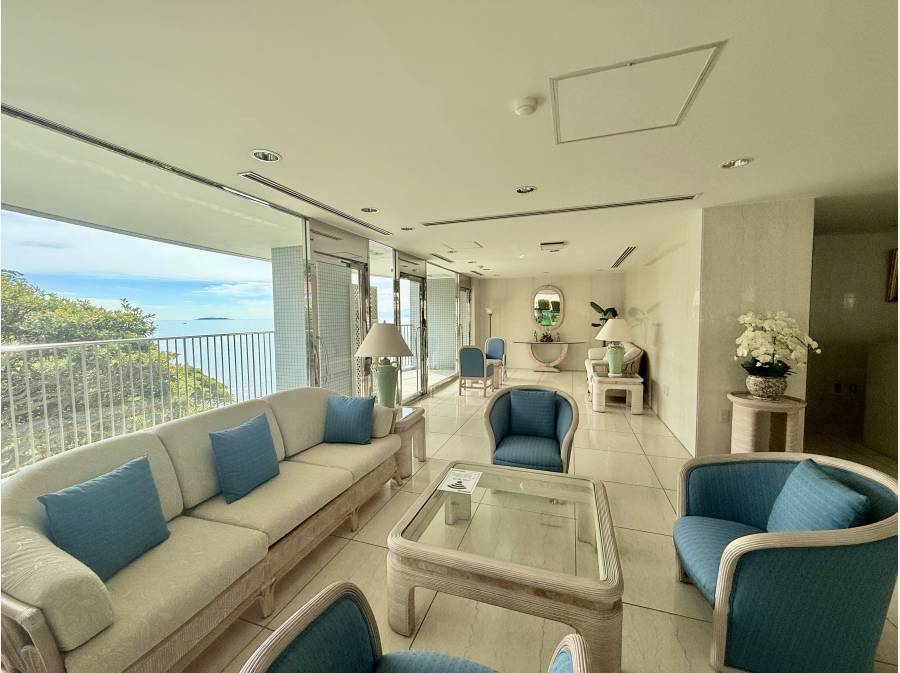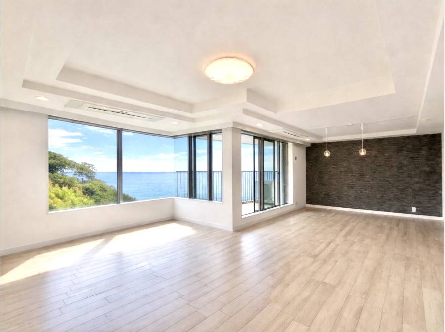 曲線を描くバルコニーに面した約23帖の大空間LDKは、ソファーに身を委ねた瞬間、相模湾の青と豊かな緑が絵画のように広がります。