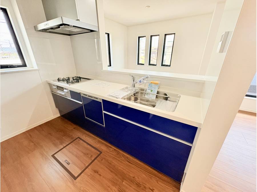 お料理が楽しくなる対面式キッチンには、後片付けを助ける食器洗浄機や便利なカップボードを備え付けています。