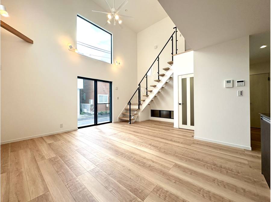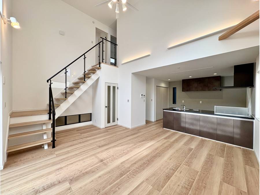 リビングダイニングは、空間に広がりをもたらす「吹き抜け天井」 となっており、家族が自然と集まる心地よい空間を演出します。