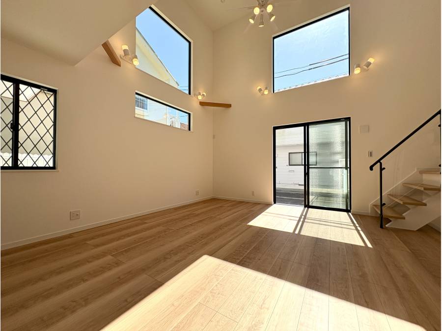 高い天井と大きな窓から注ぐ陽光が、室内に開放感とぬくもりをもたらします。