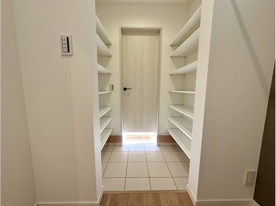 キッチン横にはパントリー、玄関横にはシューズインクロークとファミリークロークを備え、