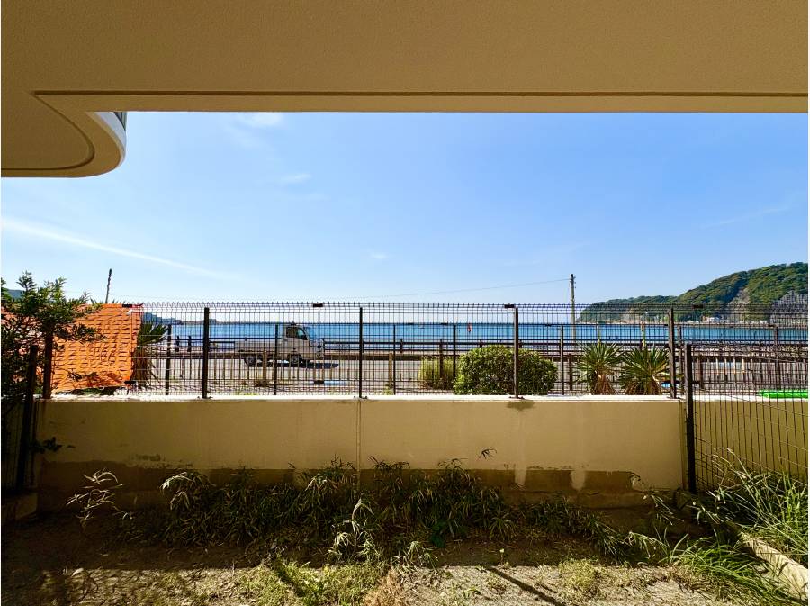 リビングからは広がる海を眺められ、1階のお部屋ながら専用庭と開放的なテラスが付いています。
