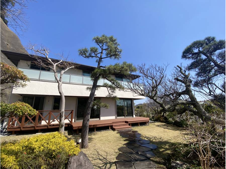 逗子の高台に佇む和風の邸宅。真鶴石の石垣が風格を添え、趣ある日本庭園を演出します。時の移ろいをゆっくりと感じる贅沢な時間をご体感ください。