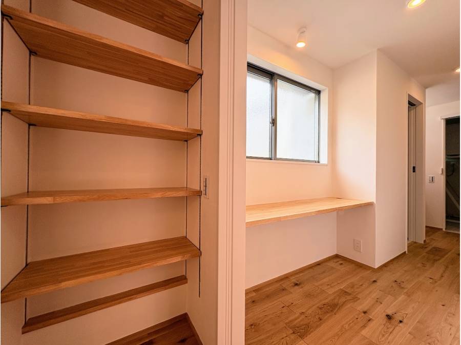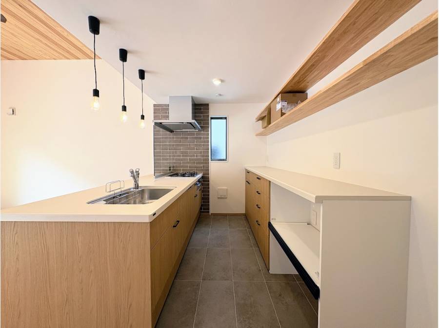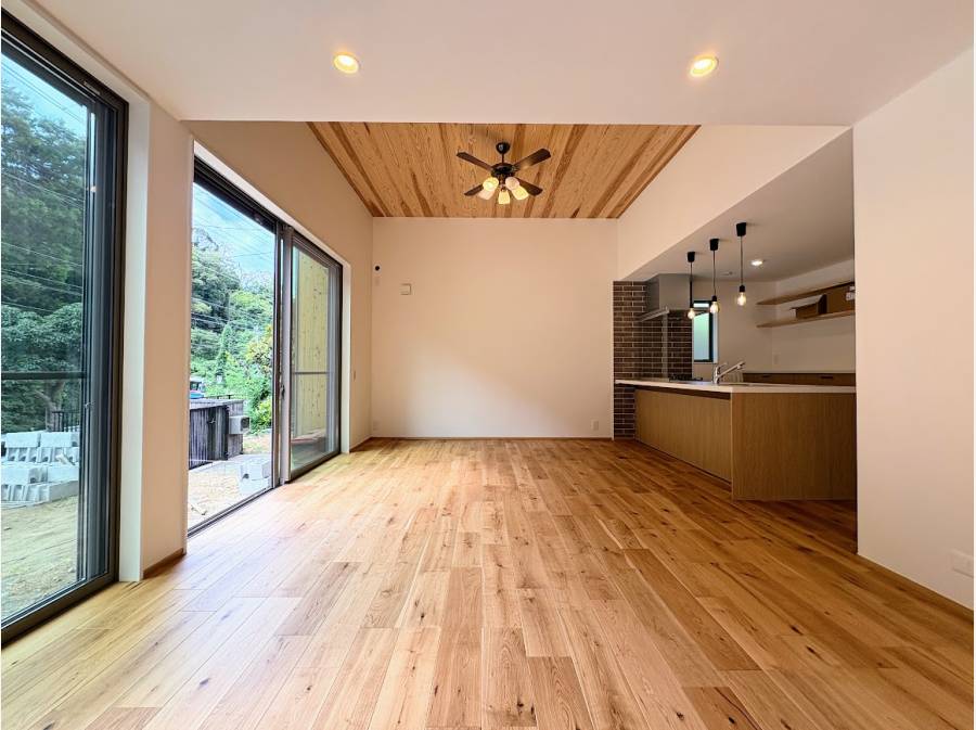 見どころは、無垢板張りの勾配天井が広がる開放的なLDK。 木の香りと質感に包まれながら、ゆったりとした家族の時間を過ごせます。また、造作の本棚や食器棚、室内物干しスペースなど、日々の暮らしを彩り、整えるための工夫を随所に凝らしました。