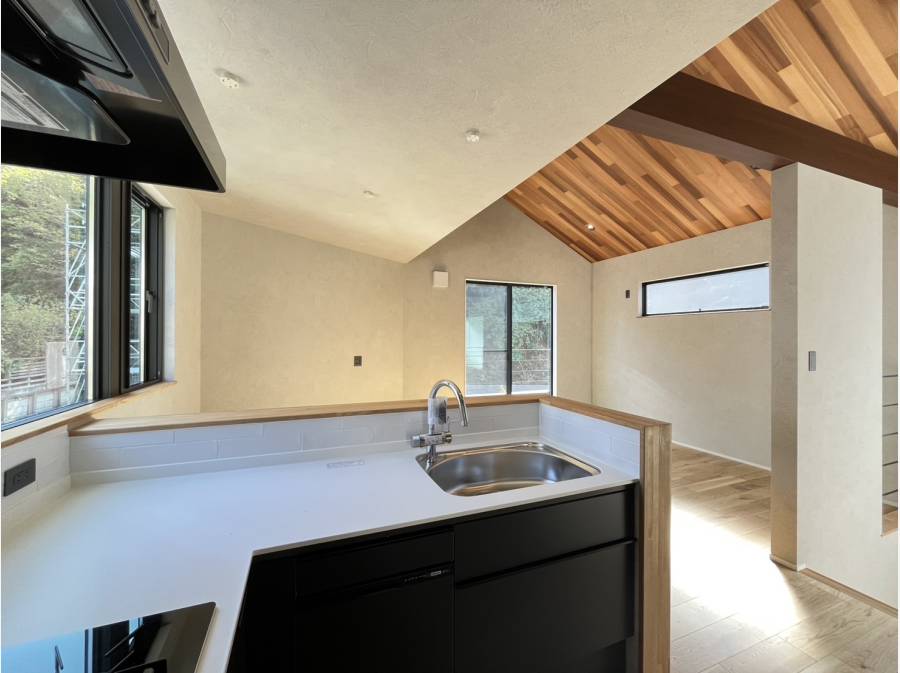 リビング上部は吹き抜け+勾配天井を採用し、明るく開放感のある空間に仕上がっています。