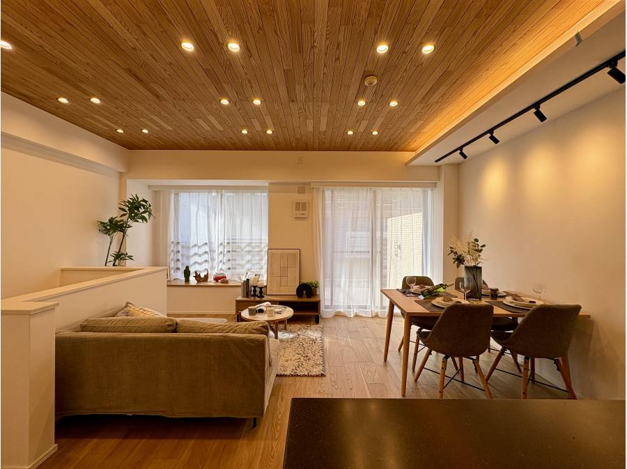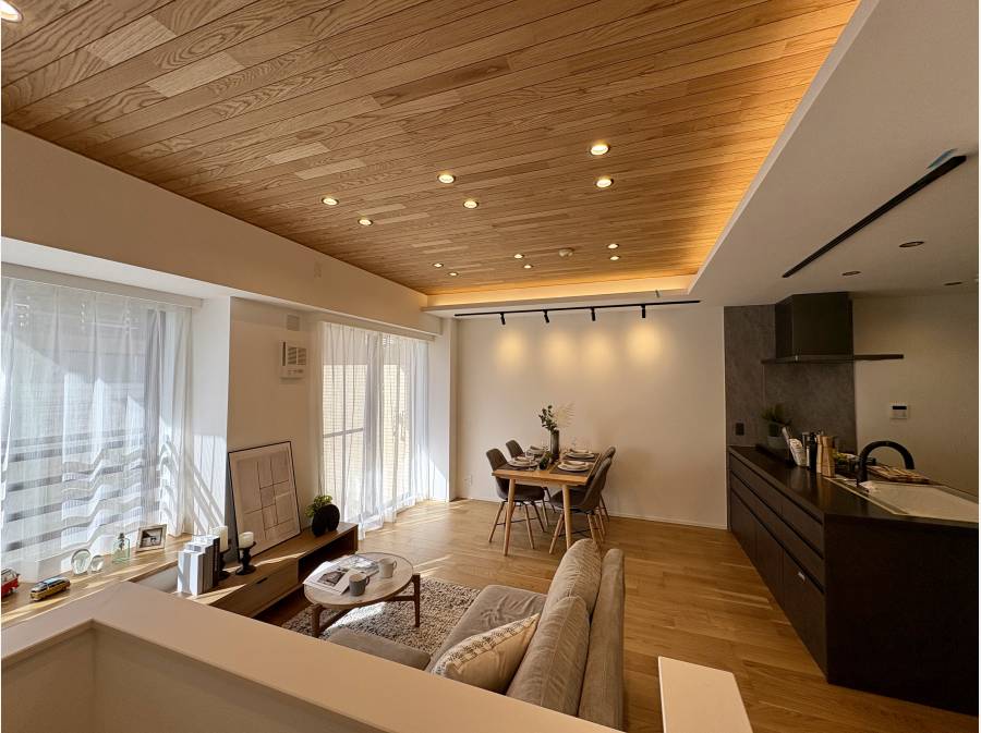 今回のリノベーションでは、LDKや廊下にオーク材の突き板フローリングを、リビングダイニングの天井には同じくオーク材のパネルを採用。