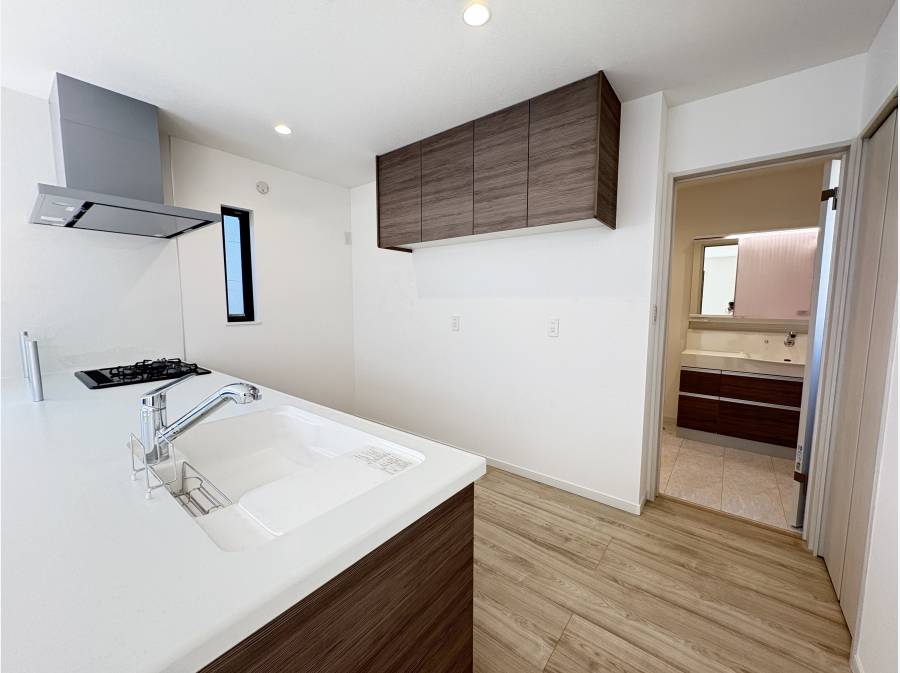 2階には天井高2800の約22.4帖のリビング、水回りも集約し家事動線もスムーズに。