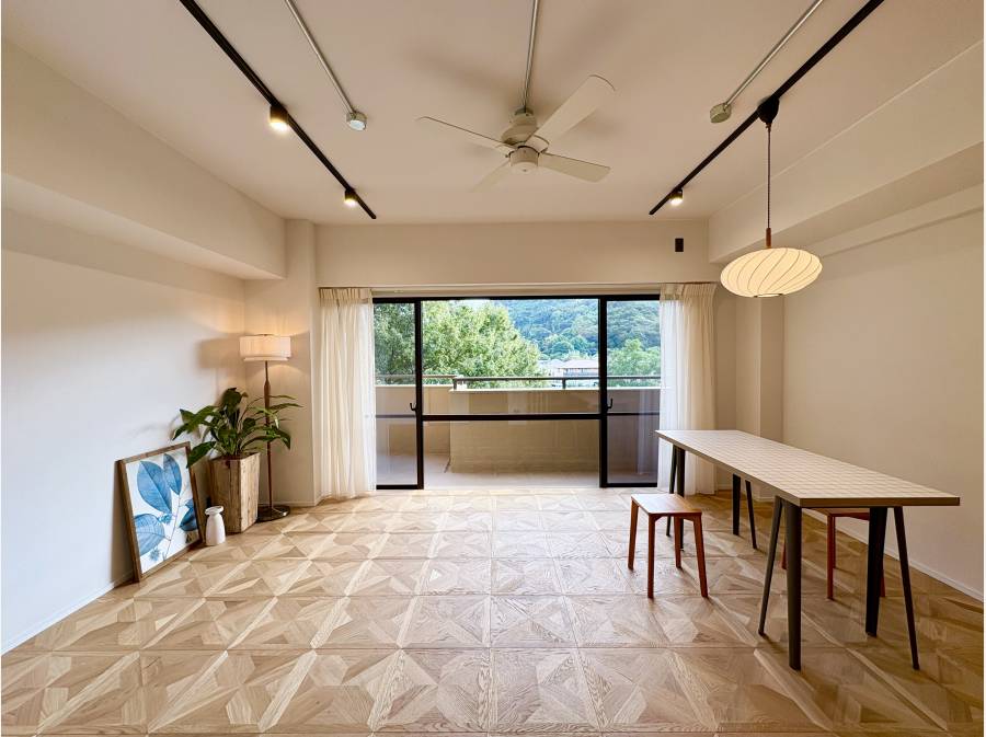 約14.6帖のLDKは、四季折々の風景を眺めながらゆったりと過ごせる、温かみのある空間です。