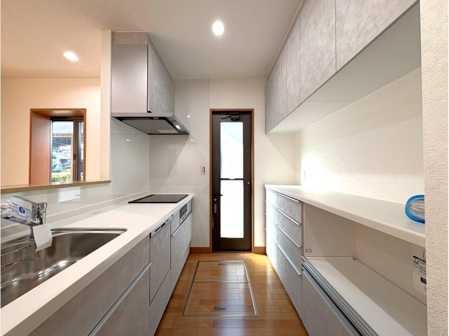 一階キッチン横には勝手口があり、採光や換気ができ明るい印象です。