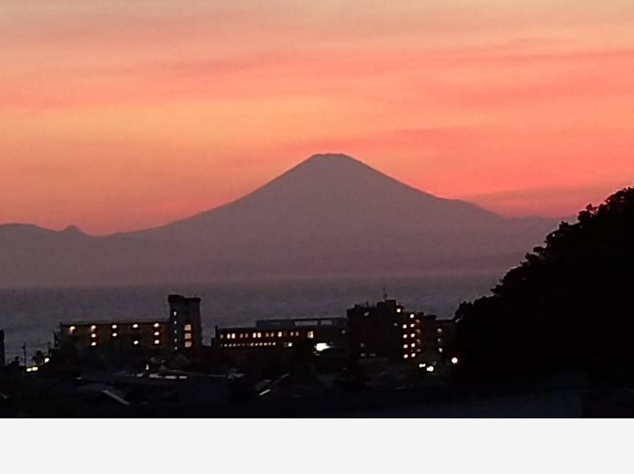 山の深い緑と、陽光を受けてきらめく相模湾。