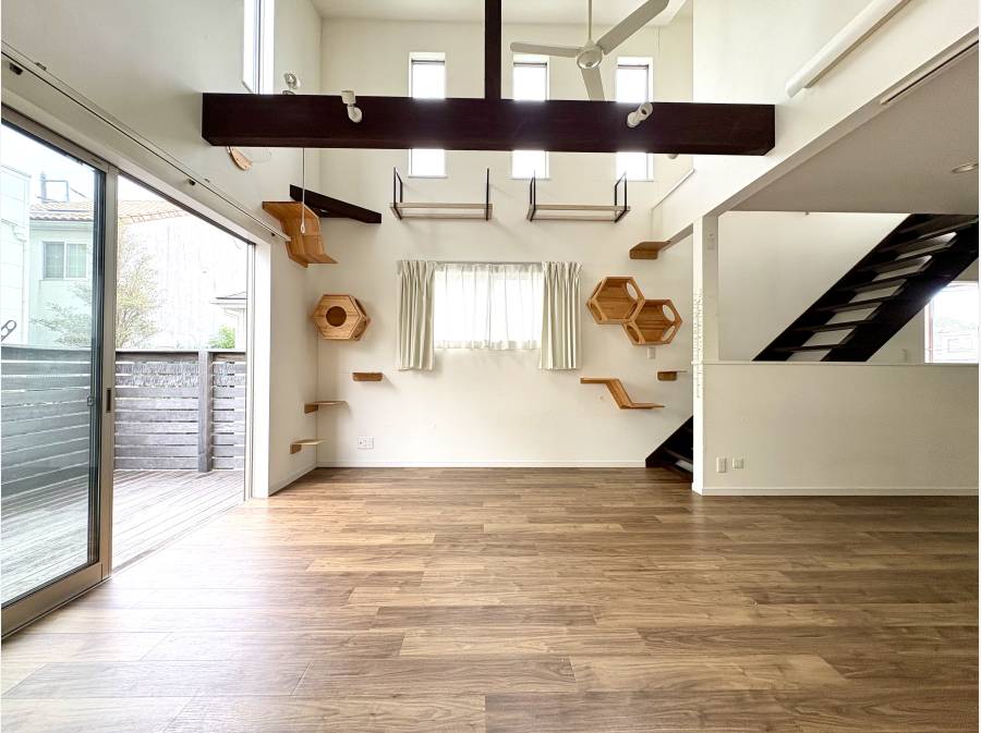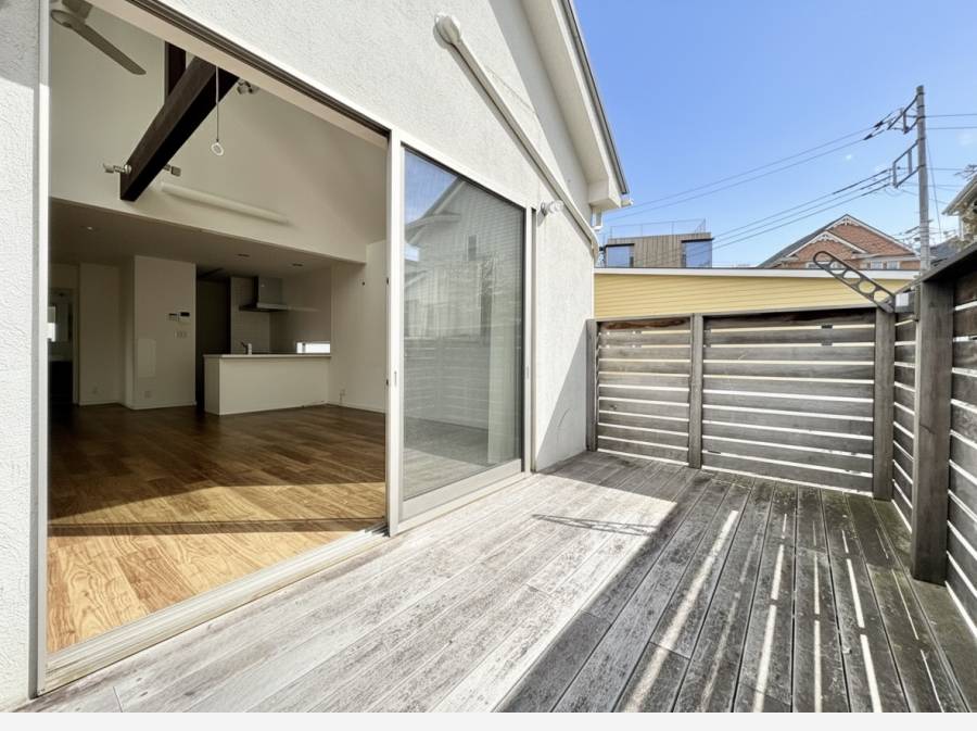 開放的なリビングの先にはウッドデッキが広がり、日差しがやさしく差し込む癒しの空間が広がります。