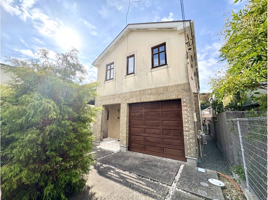 久木4丁目の穏やかな住宅街に、緑に包まれたガレージ付き邸宅が佇みます。