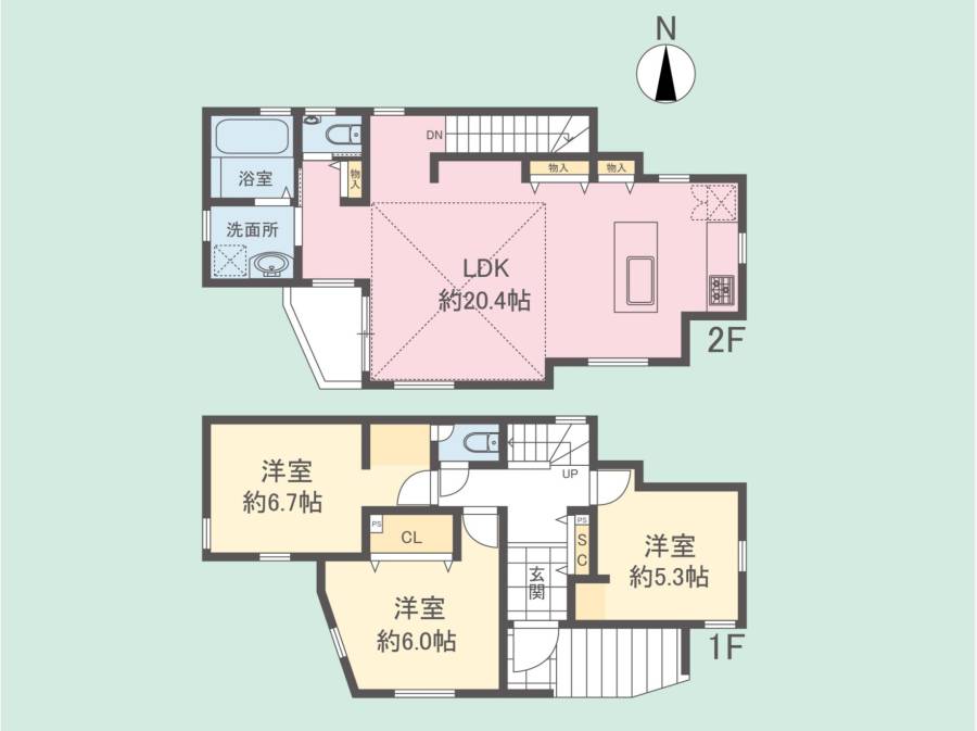 室内は吹抜天井で約20.4帖のLDKと3部屋の洋室を擁する開放感ある空間に。