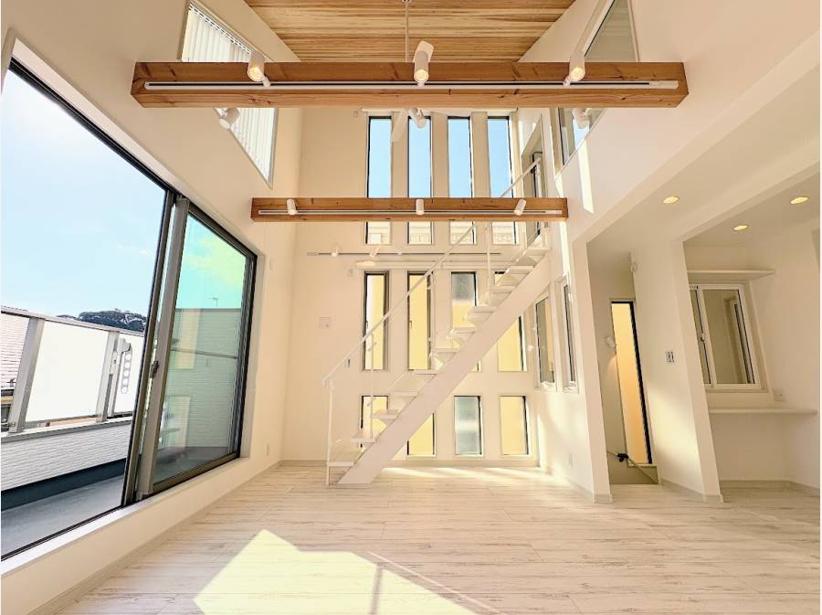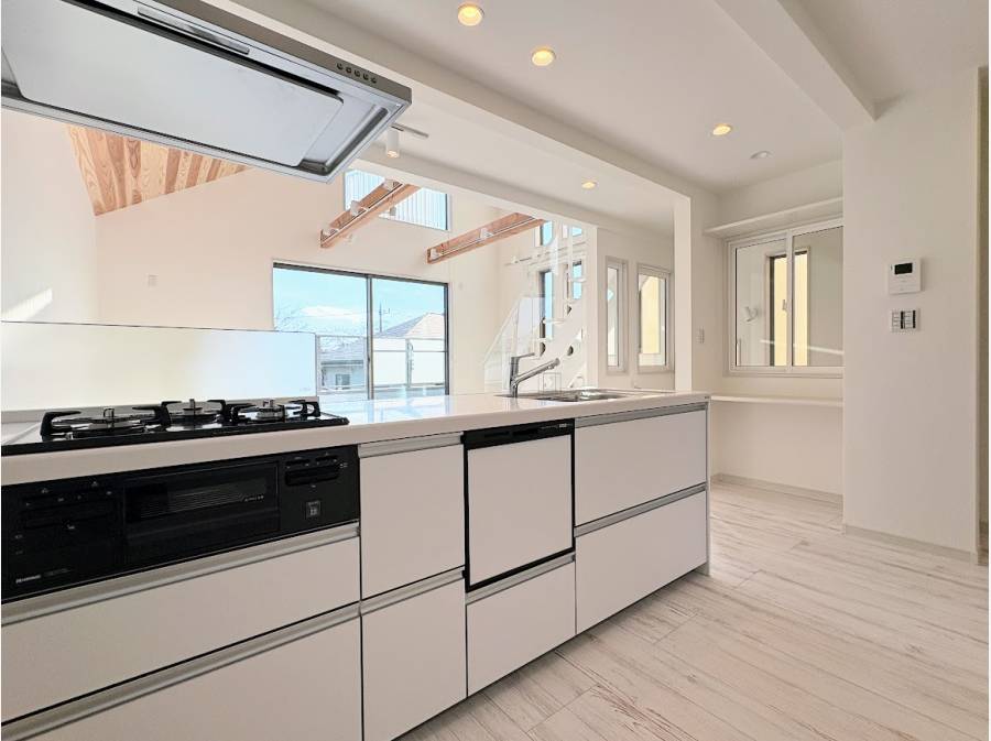 この物件の最大の魅力は、秋田杉を使用した板張り勾配天井のLDKです。室内に入ると心地よい木の香りに包まれ、大きな窓からは暖かい陽射しがたっぷりと降り注ぎます。自然素材の温もりと開放感が調和したこのLDKは、ご家族が自然と集まり、笑顔で団らんできる温かい場所となるでしょう。