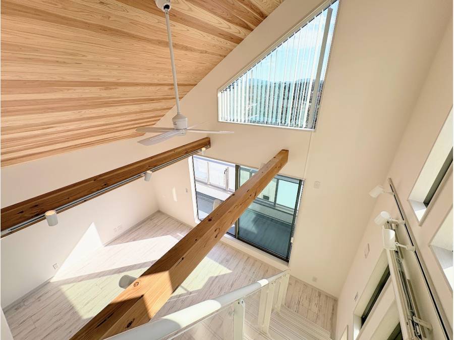 秋田杉を使用した、勾配吹き抜け天井